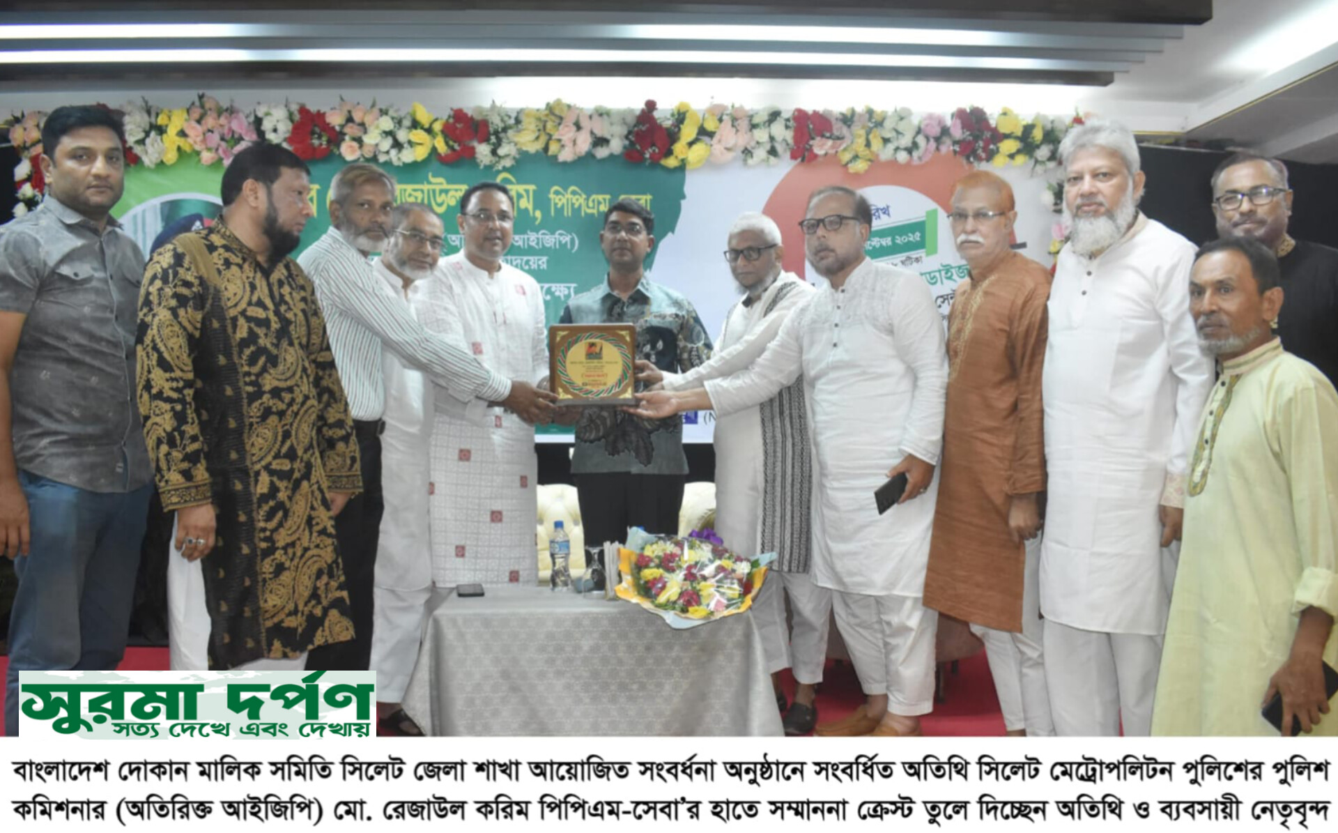 বাংলাদেশ দোকান মালিক সমিতি সিলেট জেলার উদ্যোগে পুলিশ কমিশনারকে সংবর্ধনা প্রদান
